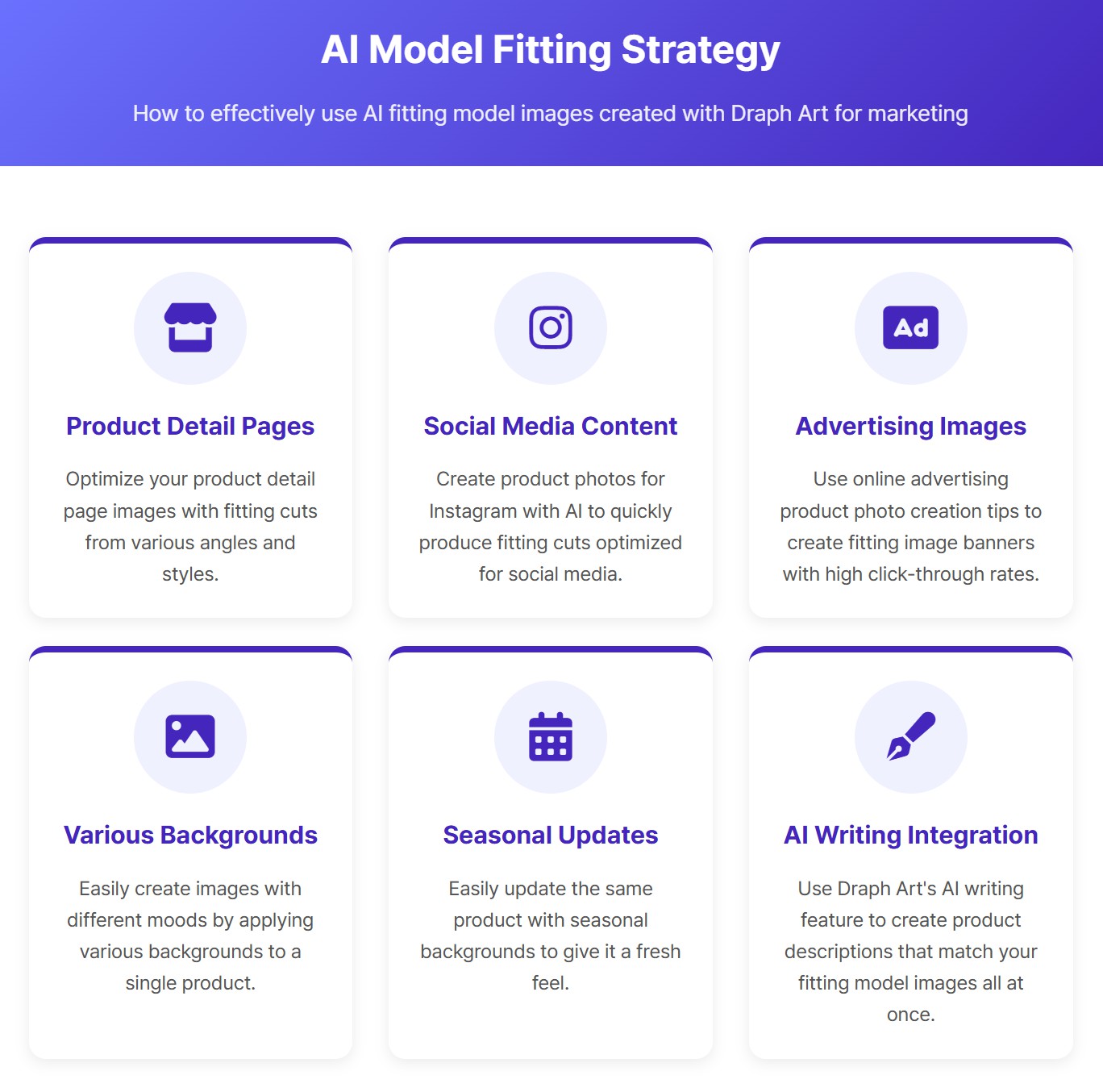 Try using fitting model images made with AI models across various marketing channels. If you use Draph Art's AI writing feature together, you can create product descriptions that match your fitting model images all at once.