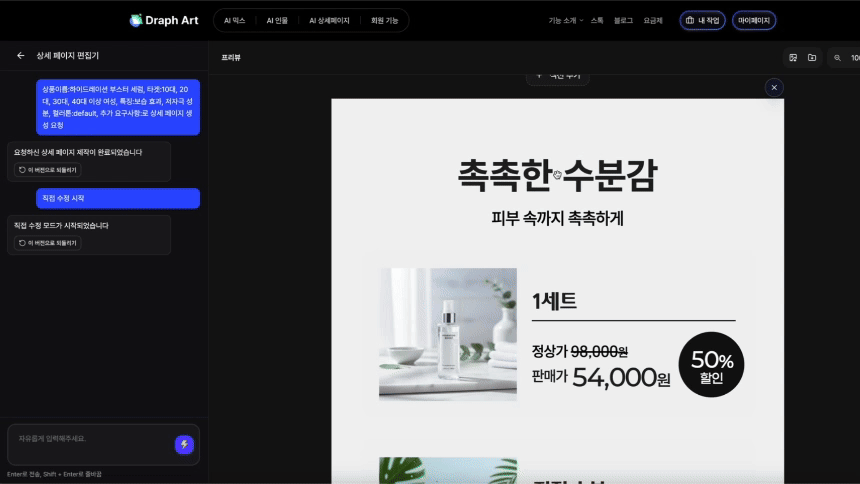 생성된 상세페이지가 마음에 들지 않는다면 대화형 인터페이스를 통해 수정할 수 있습니다. "배경을 깔끔하게 바꿔줘" 혹은 "특징 부분을 강조해 줘"라고 명령하는 것만으로 실시간 수정이 가능합니다. [드랩아트 AI 상세페이지 대화형 수정 가이드]에서 상세한 방법을 확인해 보세요.