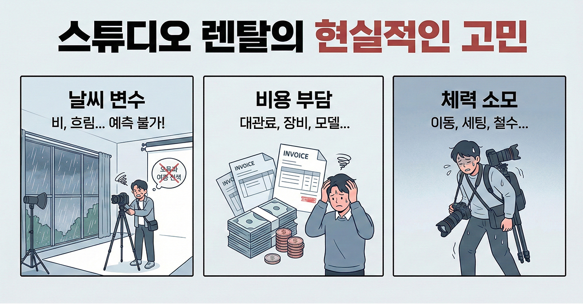 - 날씨 변수: 큰맘 먹고 자연광 스튜디오 예약했는데 비가 오거나 흐리면? (재촬영 비용 발생 🌧️)