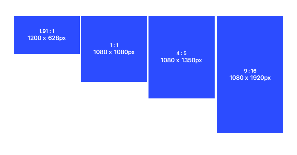 どの広告でも最も重要なのは、プラットフォームの仕様に合った広告素材をアップロードすることです。適切なInstagram広告画像サイズを使用することで、コンテンツが切り取られるのを防ぎ、ユーザーの注意を引くことができます。よく使われる画像比率は1:1、1.91:1、4:5、および9:16で、以下のInstagram広告画像サイズがあります。