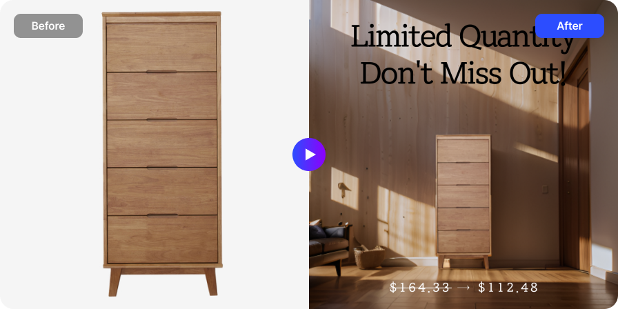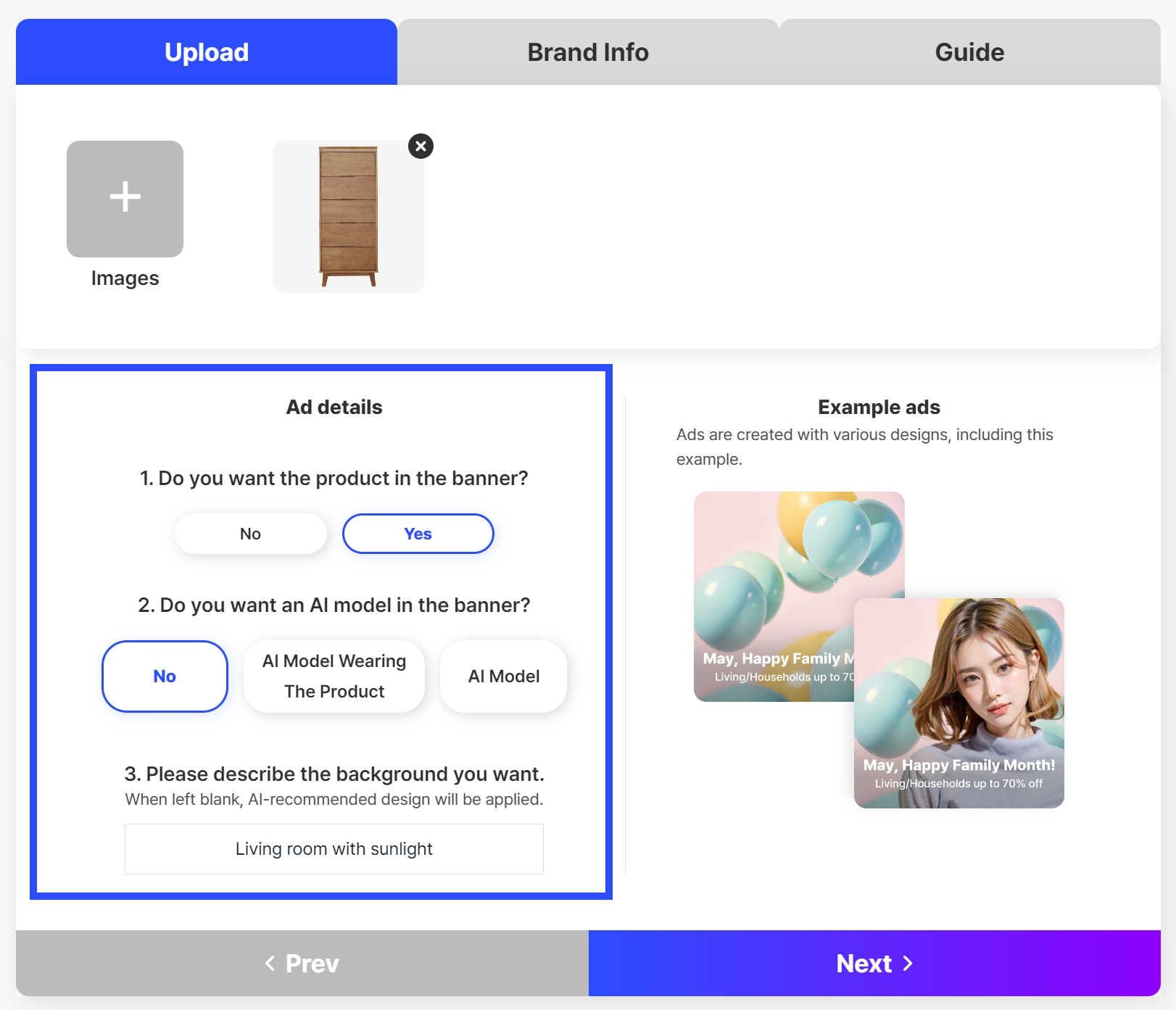 ここでは、木製の5段チェストの広告を作成してみましょう。まず、製品画像をアップロードし、広告にAIモデルを含めるかどうかを選択します。今回は製品画像を含めますが、AIモデルは除外します。広告デザインとして「 Living room with sunlight 」と入力しました。