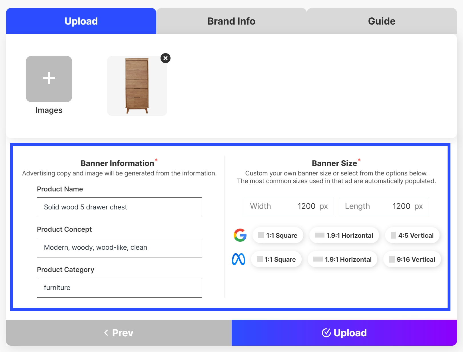 製品名、コンセプト、カテゴリを入力し、1:1のスクエアInstagram広告画像サイズを選択すると、自動的にサイズが1200x1200pxに設定されます。