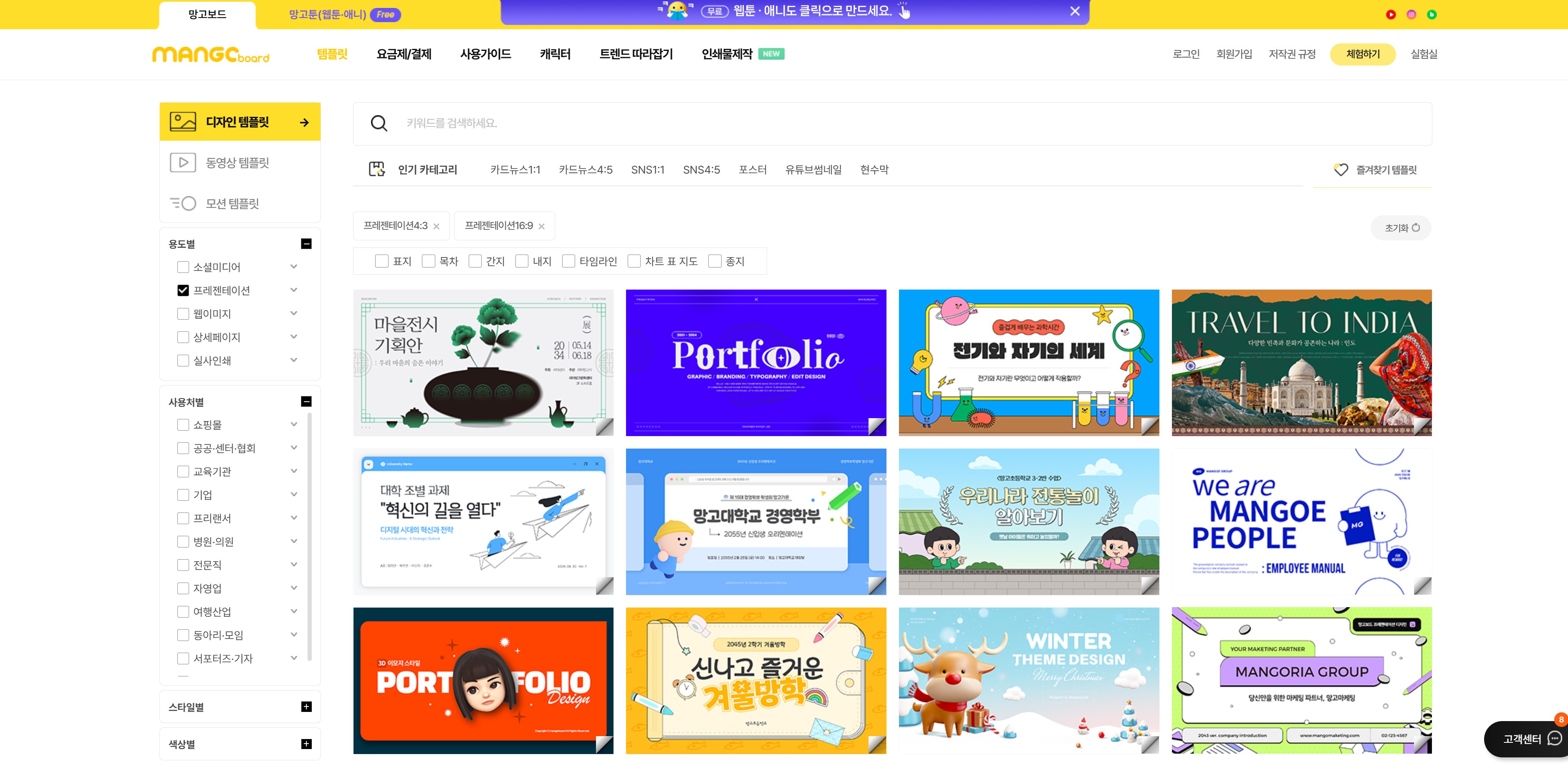 망고보드는 특히 기업 발표자료나 비즈니스 제안서 등에 활용하기 적합한 템플릿이 체계적으로 구성되어 있어 비즈니스 전문가 및 기업 실무자들에게 최적화된 솔루션을 제공해드려요.