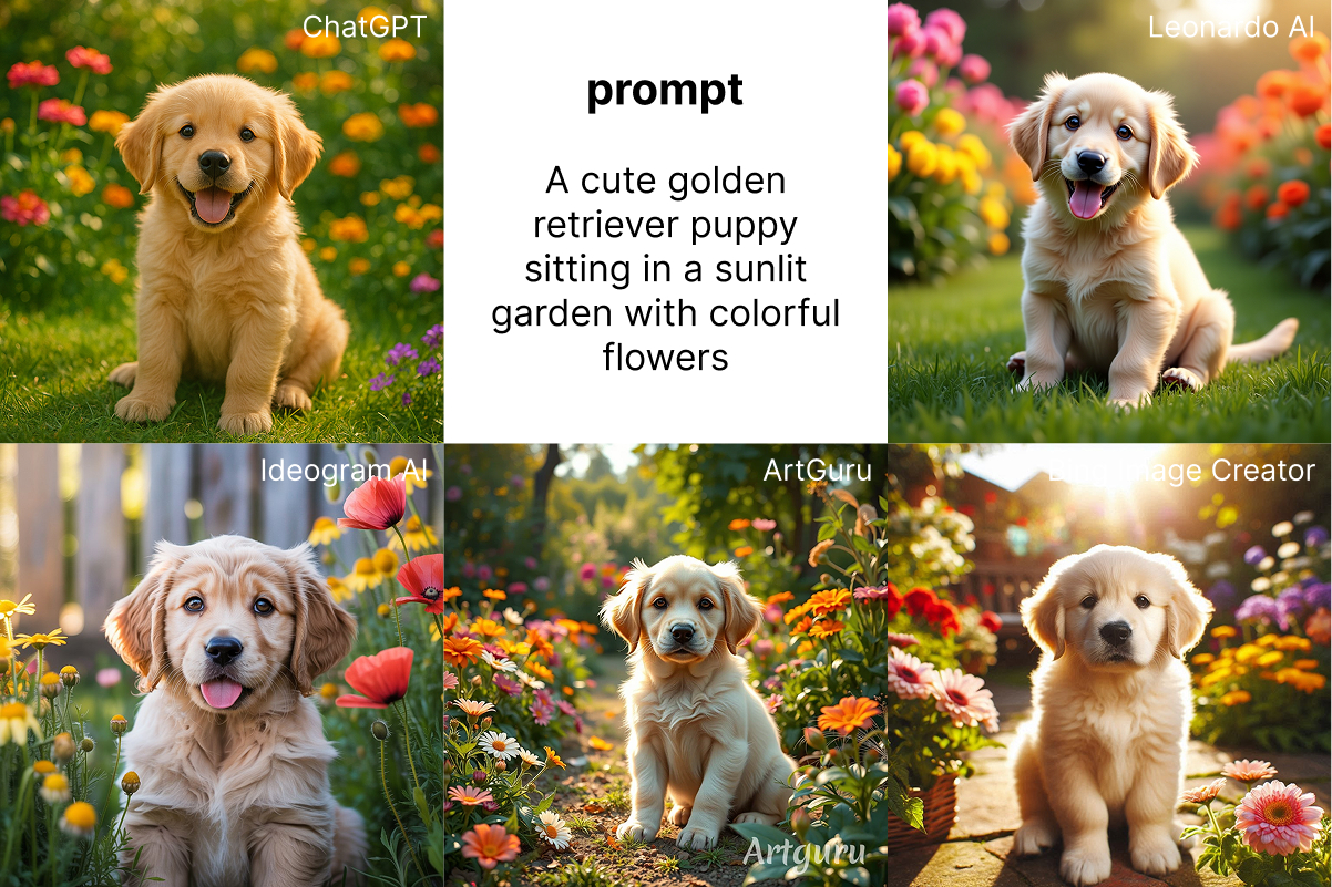 Test Prompt: "A cute golden retriever puppy sitting in a sunlit garden with colorful flowers"