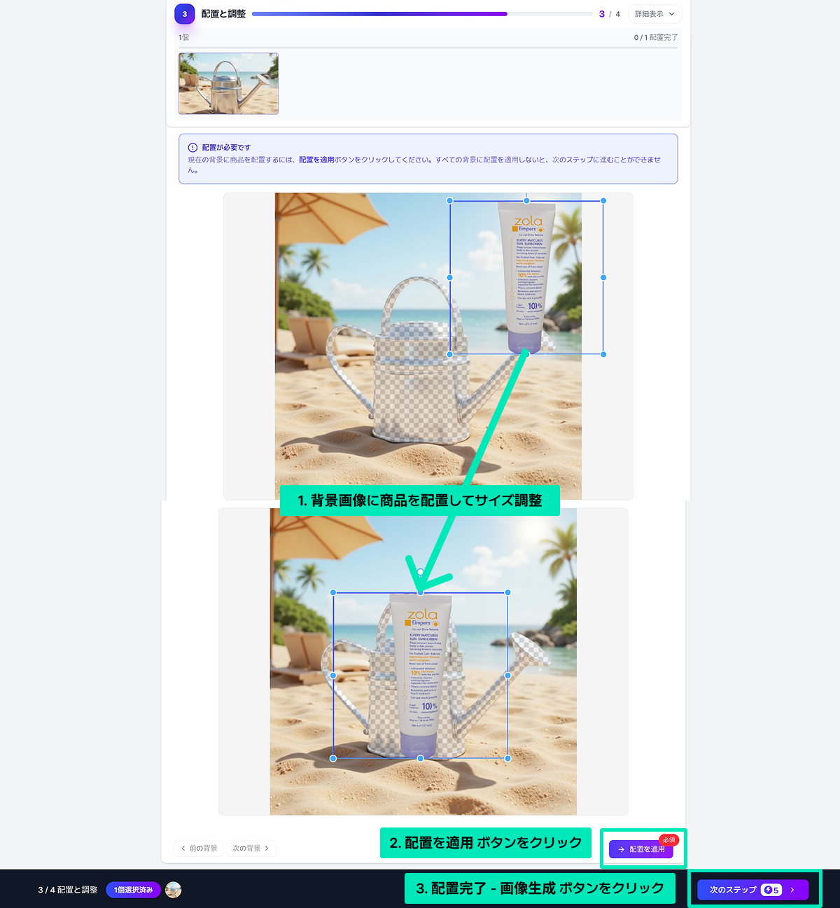 選択した背景画像で私の商品をどこに配置するかを決めるステップです。**AI合成は選択した背景画像にある既存商品を消して、その位置に私の商品を合成してくれるものなので、既存商品の上に私の商品を配置すればよいです。**この時、商品サイズも調整できます。