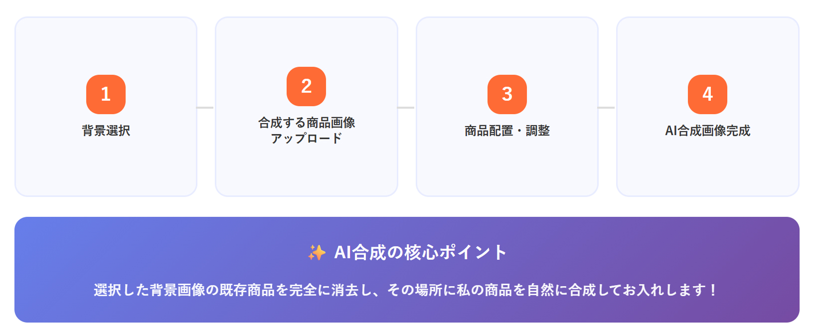 AIが選択した背景に私の商品を自然に合成してくれます。既存商品は消えて私の商品に完璧に置き換わります。