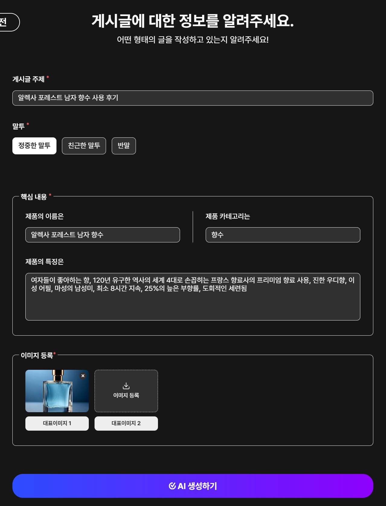- 블로그(제품 홍보, 후기), 인스타그램(정보성 콘텐츠), 상세페이지 세 가지 유형의 콘텐츠를 제작할 수 있으며, 말투도 정중한 말투, 친근한 말투, 반말 중 선택 가능해요.
