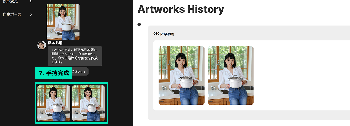 ⑤ Artworks History: Images generated through chat are saved in the artwork history.