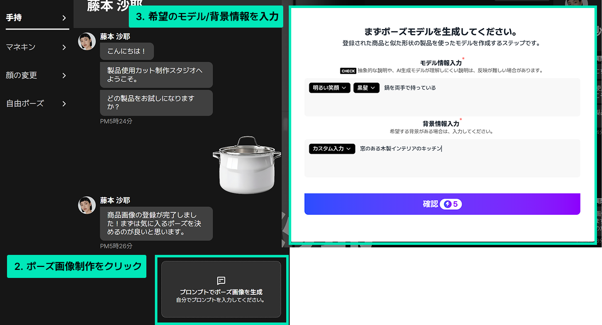 In addition to the default options for expression, hair color, and background, you can enter any additional physical characteristics or poses you want for the model. Also enter your desired background for the image. Click confirm to start generating the pose image. (5BP deducted)