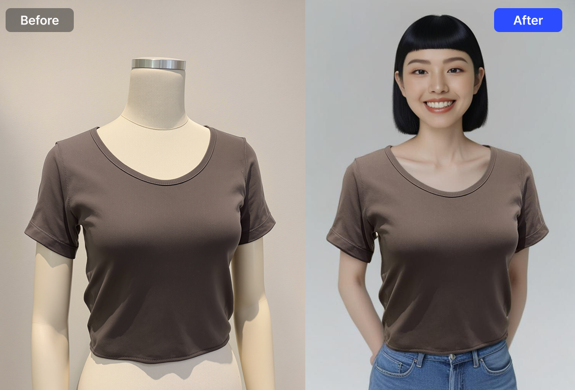 The mannequin change feature is identical to the previous 'model change' feature. It transforms mannequin images into model images. You can also change the background of the original image at the same time.