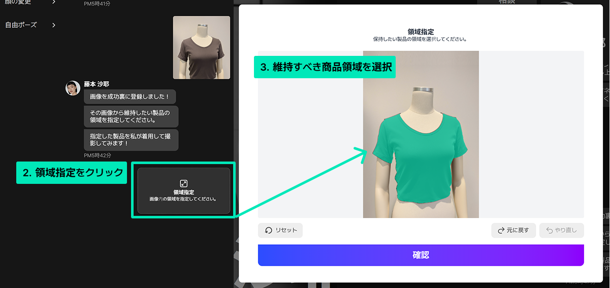 For clothes, select the clothing area; for hats, select the hat area; for shoes, select the shoe area. Click confirm to start generating the model image actually wearing your uploaded product. (10BP deducted)