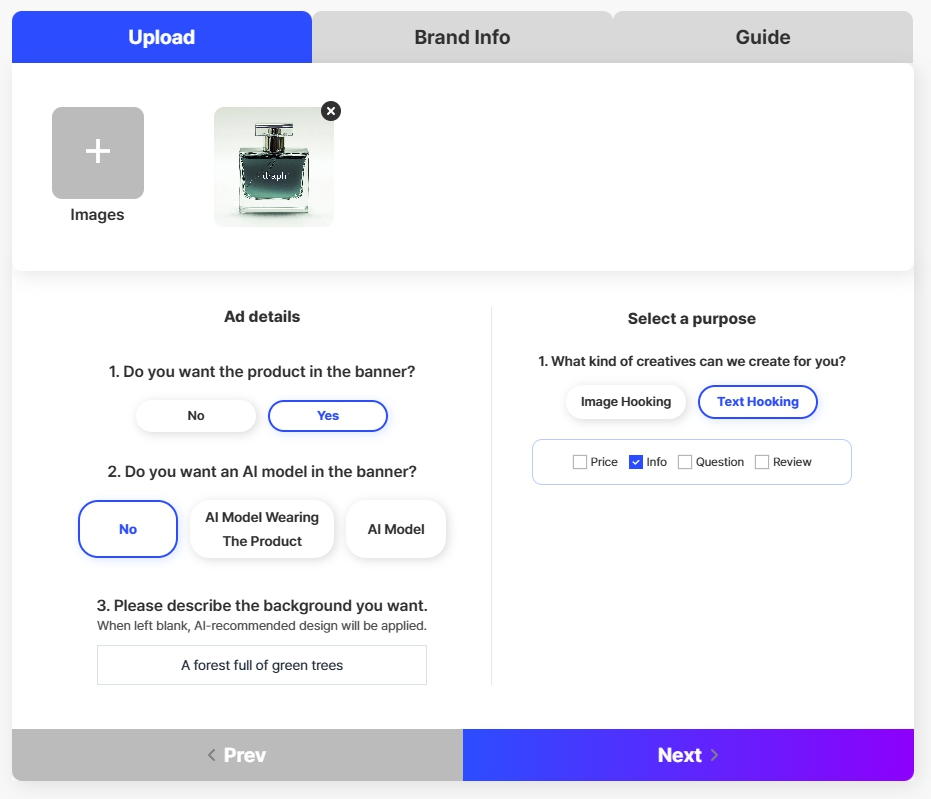 Choose specifics like whether to include products or AI models, and input your desired ad design.