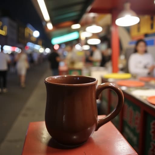 Camping table, outdoor equipment, bustling night market street, moody ambiance