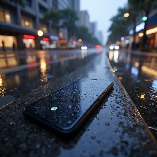 Low wooden table, furniture, home decor, interior design, Subdued, overcast ambiance, photo-realistic, Glass window with raindrops, outside view blurred by rain, wet reflections on glass.
