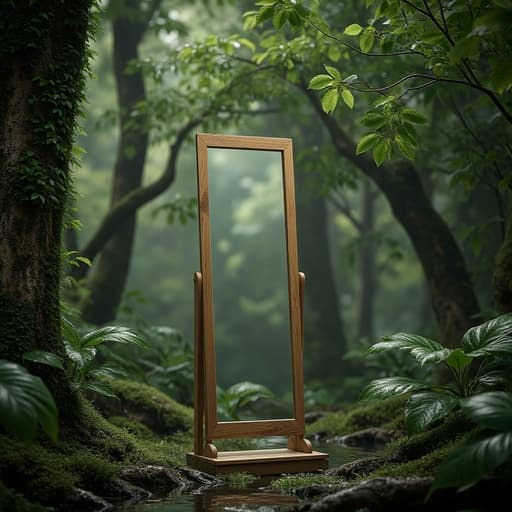 full-length mirror, furniture, amidst dense forest, rain-soaked leaves, ground wet, soft mist, ambient light through canopy, serene, calm