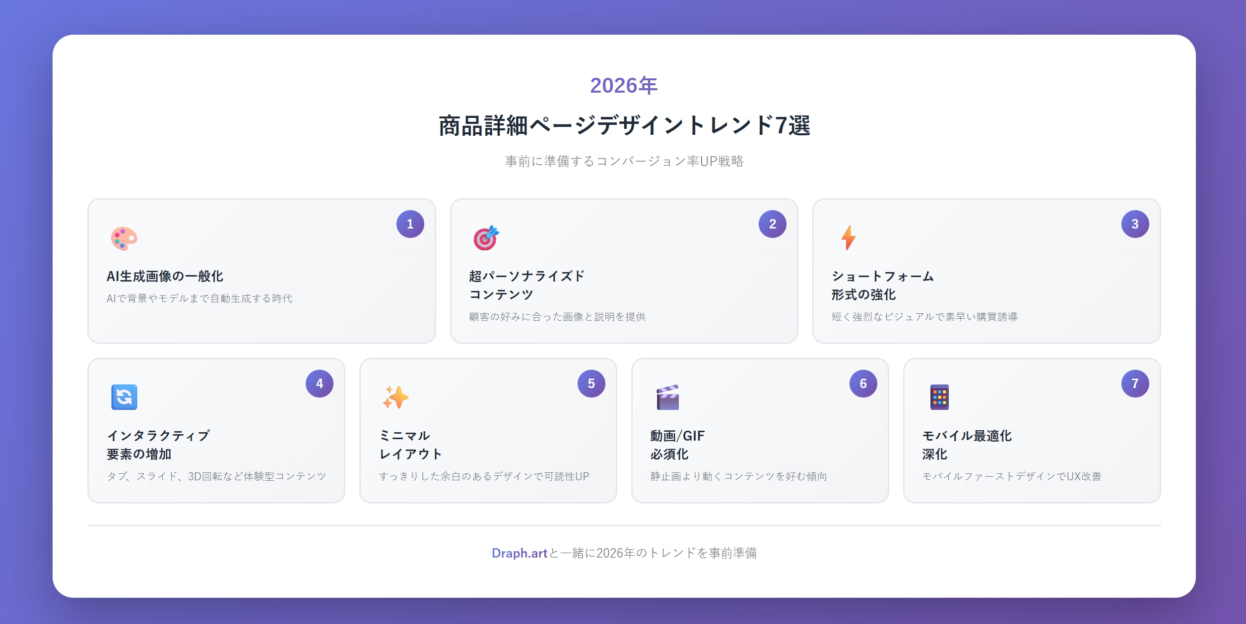 そこで今日は、2026年の商品詳細ページデザイントレンドを先取りして、今からどう準備すればいいかお伝えします。ドラップアートがAI技術でどうサポートできるかも一緒にご紹介しますね!