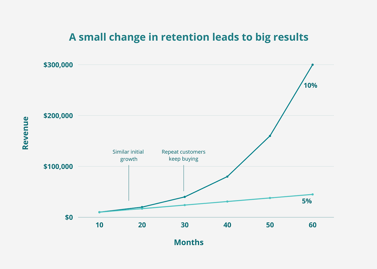 Do you know why it’s crucial to increase the number of loyal customers when running an online store? If you look at the graph above, it shows the changes in revenue when the repurchase rate of a store is 5% versus 10%. You can see that the 10% graph shows a much steeper increase in revenue than the 5% graph. This means that as the store operates for a longer period, the proportion of loyal customers has a significant impact on the store's revenue growth. Therefore, if you're not planning to stop after a short run, increasing the number of repeat customers becomes more important than acquiring new customers to increase profit.