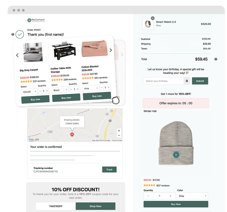 If you check out the order confirmation pages of overseas online shopping sites like Shopify, you’ll see that they actively use this page. As shown in the image, they showcase related products, promote their social media accounts, or provide feedback opportunities that could lead to another purchase. If you're able to customize the order confirmation page, it's a good idea to include elements like these that naturally prompt another click from the customer.