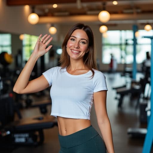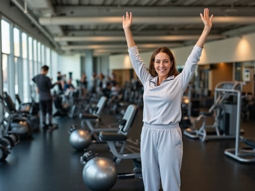 40代の白人女性が最新のフィットネススタジオで運動機器をデモンストレーションしながら明るい笑顔を見せています。スタイリッシュなアスレチックウェアを身に着け、広々としたジムの背景には最新のフィットネス機器が揃っており、エネルギッシュでモチベーションを高める雰囲気を作り出しています。