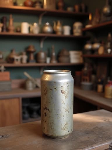 木製のまな板、キッチン用品、ビンテージアンティークショップ、素朴な木製棚、柔らかな照明、暖かいトーン、埃っぽい雰囲気