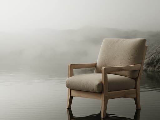 #湖、庭、朝、霧、木製ベンチ
