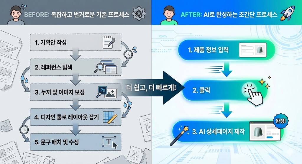 만약 제품 정보만 입력하면, 설득력 있는 문구부터 디자인 배치까지 AI가 알아서 한 번에 완성해 준다면 어떨까요?