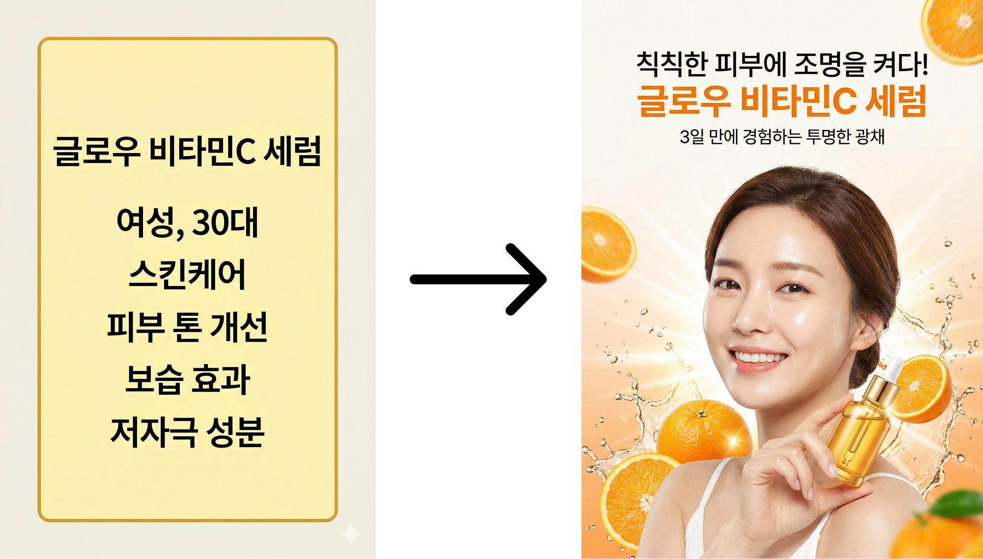 고객은 '히알루론산'을 사고 싶은 게 아니라 '건조함 해결'을 사고 싶어 합니다. 이미지 생성 ai 기술을 활용해 촉촉한 피부 표현을 시각적으로 보여주는 것도 좋지만, 텍스트로는 반드시 고객이 겪을 구체적인 상황을 짚어줘야 합니다.