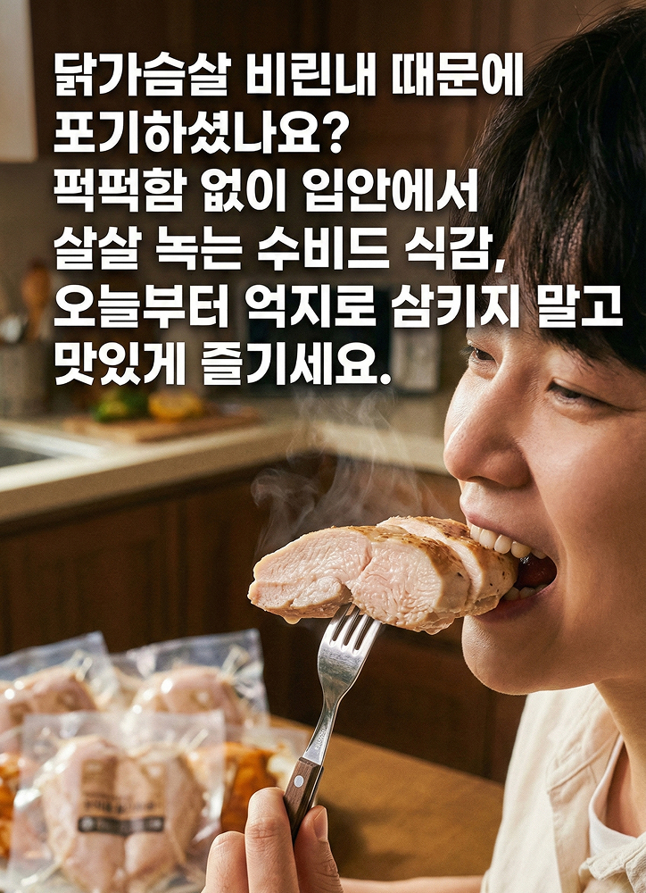 - 좋은 예: 닭가슴살 비린내 때문에 포기하셨나요? 퍽퍽함 없이 입안에서 살살 녹는 수비드 식감, 오늘부터 억지로 삼키지 말고 맛있게 즐기세요.