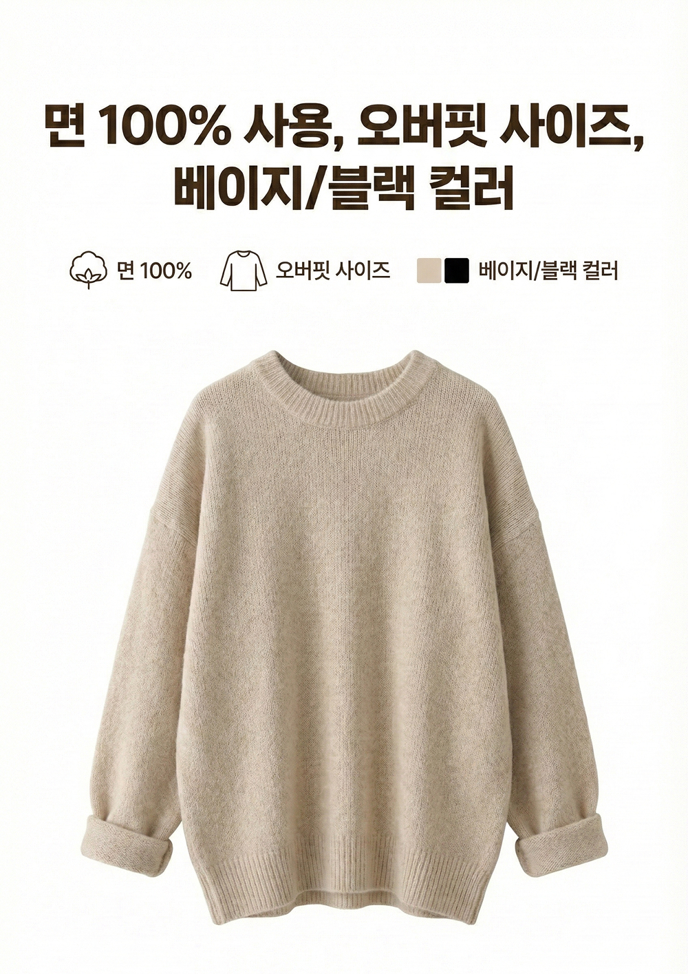 - 나쁜 예: 면 100% 사용, 오버핏 사이즈, 베이지/블랙 컬러